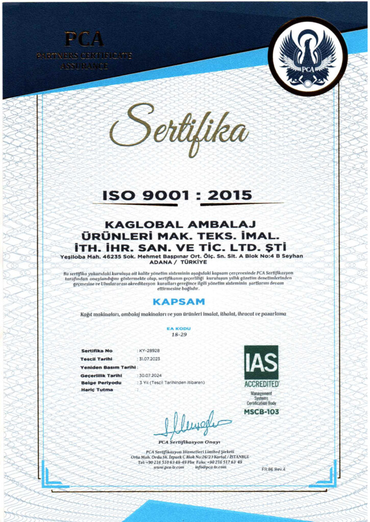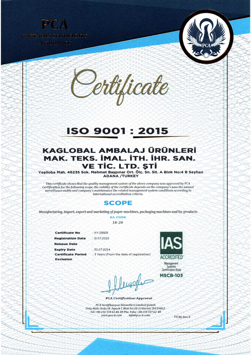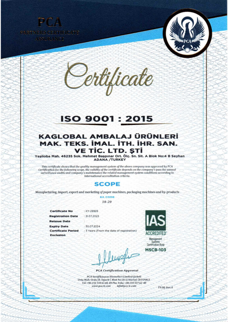 Türkiye’nin Adana ilinde kayıtlı Büyük Sanayi Kuruluşları içerisinde yer alan Ka Makine Sanayi, ISO 9001 Kalite Yönetim Sistemi, İş Sağlığı ve Güvenliği Yönetim Sistemi, CE belgeleri sahibidir.