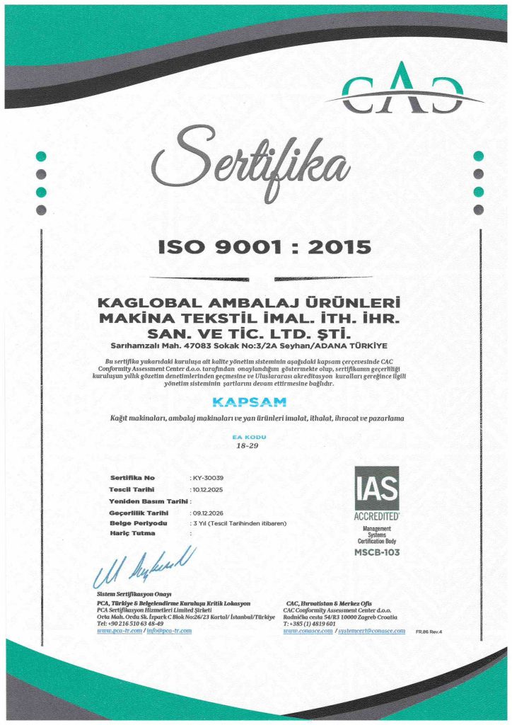 В компании Kaglobal наша политика в области качества направлена на наилучшее удовлетворение потребностей и ожиданий наших клиентов в производстве бумаго- и упаковочного оборудования, а также на поддержание доверия, оказанного нашей компании как внутри страны, так и за рубежом. Это включает в себя: пристальное отслеживание новых технологий и разработок, адаптацию к меняющимся и развивающимся ожиданиям клиентов и предоставление услуг, отвечающих этим ожиданиям, для обеспечения удовлетворенности клиентов; внедрение и постоянное совершенствование нашей системы управления качеством без компромиссов; предоставление всей необходимой технической поддержки нашим клиентам после продажи, что всегда делает нас надежной компанией; обеспечение непрерывного обучения и развития талантов и навыков наших сотрудников, достижение целей компании в командном духе, постоянное развитие и рост на целевых рынках, а также защиту и развитие наших общих интересов в сотрудничестве с нашими поставщиками.