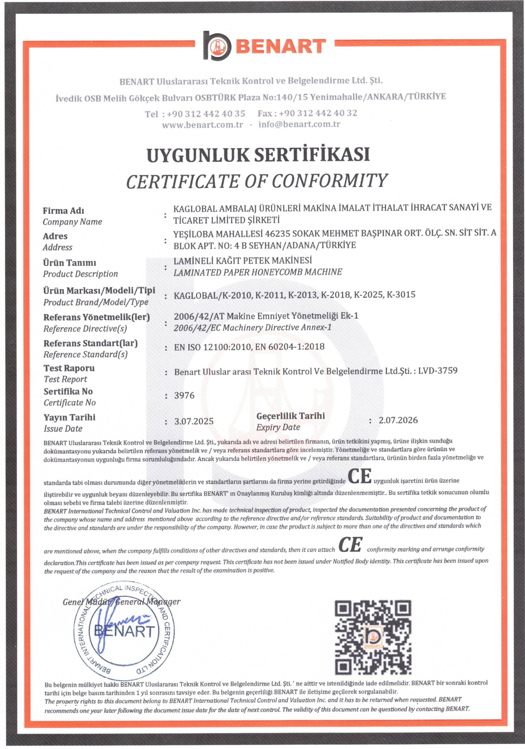 Компания Kaglobal Sanayi, зарегистрированная как крупное промышленное предприятие в Адане, Турция, имеет сертификаты системы управления качеством ISO 9001, системы управления охраной труда и техникой безопасности, а также сертификат CE.